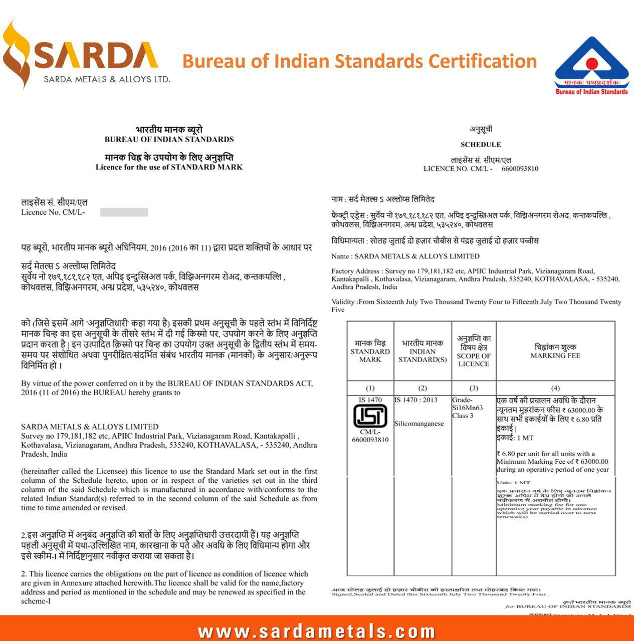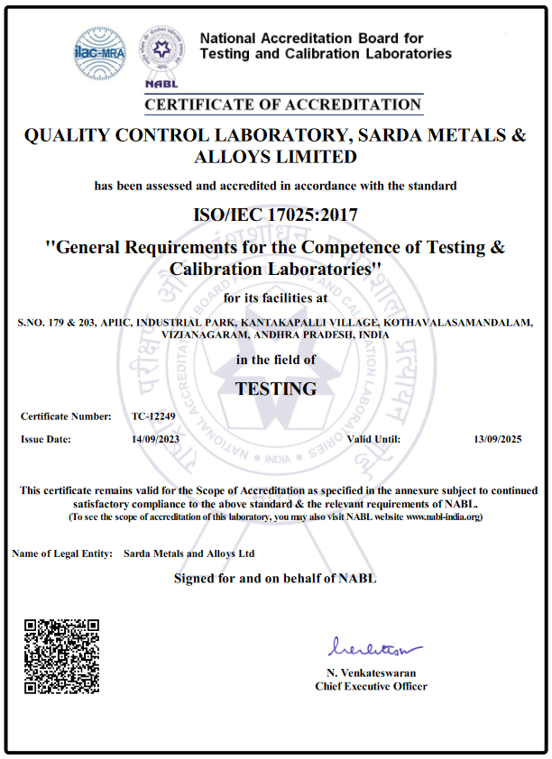 Sarda Metals & Alloys Ltd. is proud to announce that it has been awarded the Bureau of Indian Standards (BIS) certification, marking a significant milestone in our commitment to quality and excellence in the metal and alloy industry. This prestigious certification recognizes our adherence to the highest standards of quality, safety, and reliability in our products and processes. The BIS certification is a testament to Sarda Metals & Alloys Ltd.'s dedication to maintaining rigorous quality control measures and continuously improving our manufacturing processes.